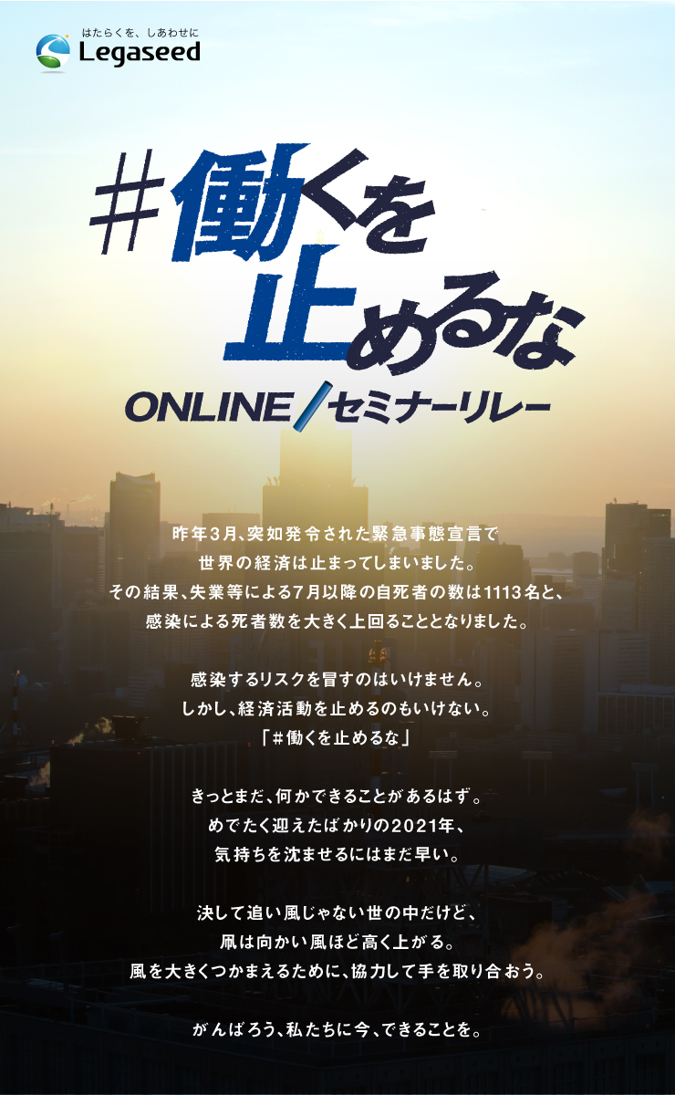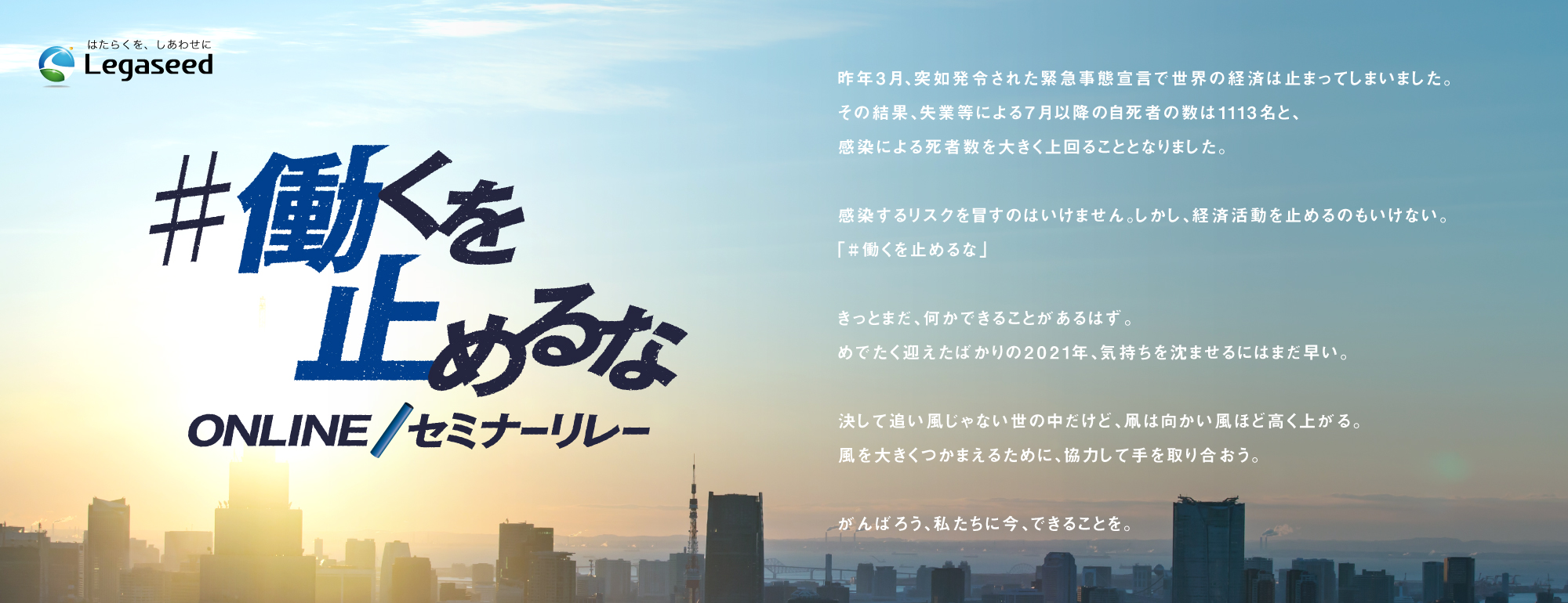 弊社代表の近藤から始まり、初めの10日間(2021年1月12日(火)~2021年1月22日(金))はLegaseedの役員・社員が登壇者を務めます。しかしながら、Legaseedからお伝えできることには限りがあるため、この「#働くを止めるな」という運動に、賛同していただける方を募集させていただきます。